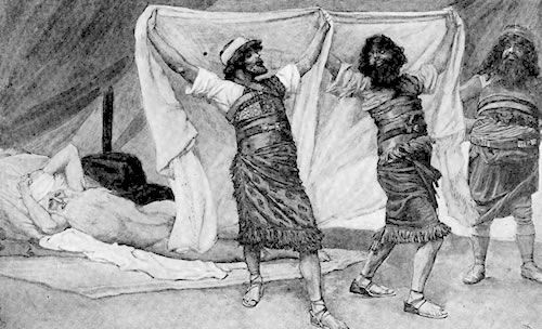 “Noah, a man of the soil, proceeded to plant a vineyard. When he drank some of its wine, he became drunk and lay uncovered inside his tent. Ham, the elder son, saw his father naked and told his two brothers outside. But Shem and Japheth took a garment and laid it across their shoulders; then they walked in backward and covered their father’s naked body. Their faces were turned the other way so that they would not see their father naked. When Noah awoke from his wine….”