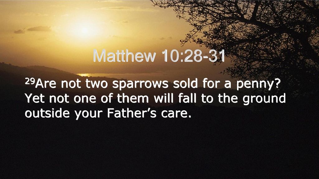 God reminds me that He has a purpose for every life. Jesus illustrates this by describing God’s care for sparrows. God created every form of life on earth, including the lowly sparrow. If God cares about sparrows, He obviously cares about His own people more. My dad surely will not fall to the ground without my Father knowing and caring and, my confidence comes in knowing that nothing happens without God’s knowledge and care: hard times are not a sign that God has forgotten us.
