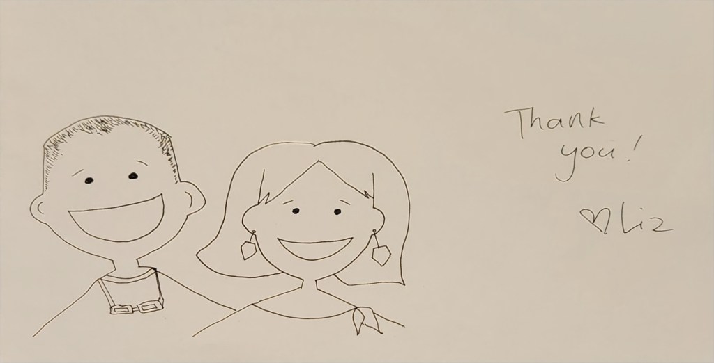 I was cleaning up the living room and noticed a sheet of paper from the notebook her friend was working on. It was carefully placed under a side plate to get our attention. I glanced at it and, for a moment, was speechless. Her friend had, whilst I assumed she was rude, focused on sketching the two of us!